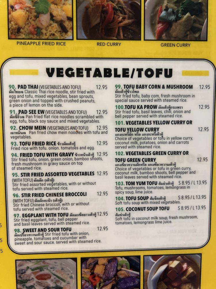 Choice of vegetables or tofu in yellow curry, coconut milk, potatoes, onion and carrots served with steamed rice.